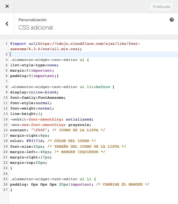 Mini tutorial para explicar rápidamente como se puede cambiar las viñetas (horrorosas) que vienen por defecto en WordPress y utilizar en su lugar los iconos de FontAwesome.