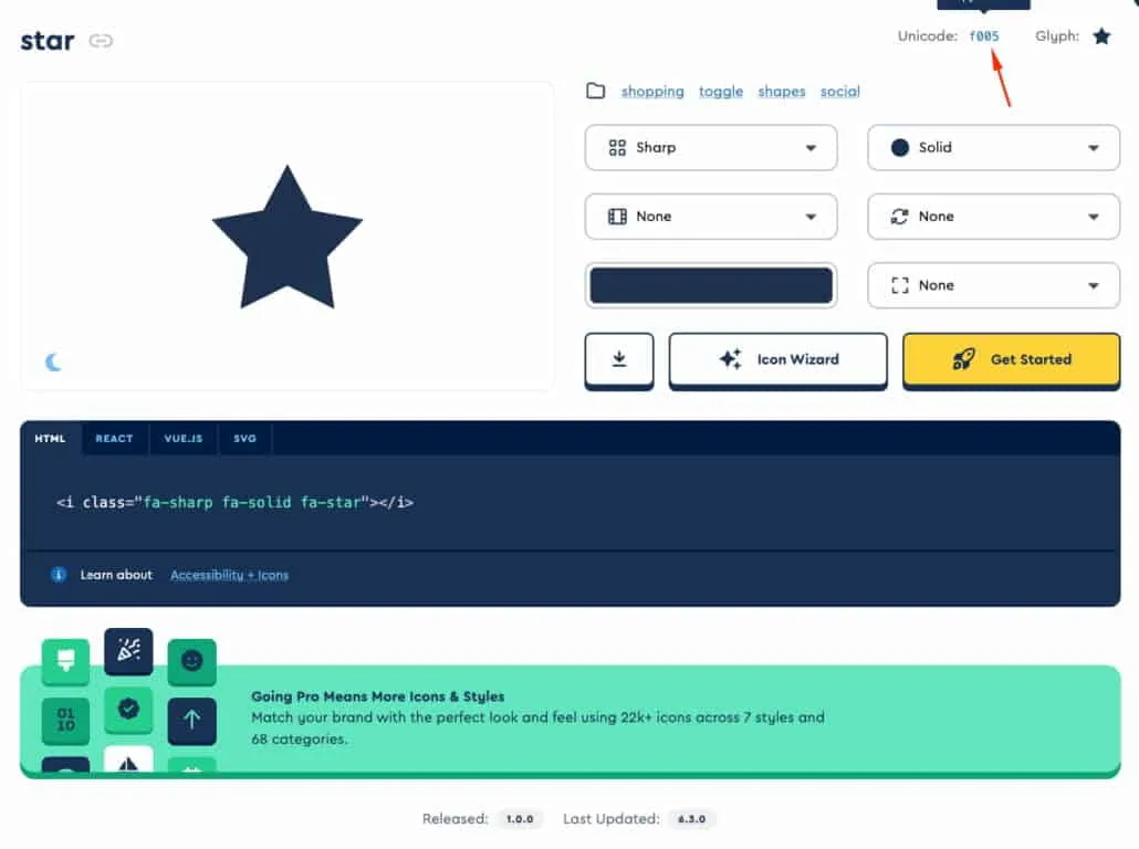 El código del icono es el que tienes que poner en el código CSS en el content en mi caso he puesto la estrella que corresponde con el código \005