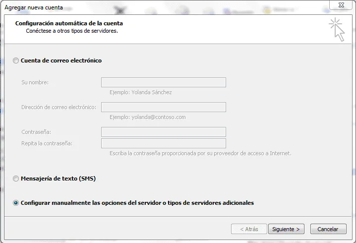 - Seleccione la casilla Configurar opciones del servidor o tipos de servidores adicionales manualmente. Haga clic en Siguiente.