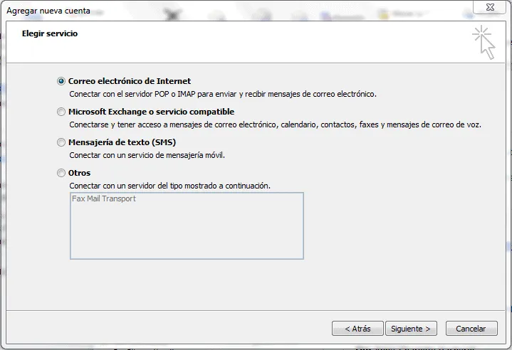 - Seleccione la opción Email Internet y haga clic en Siguiente.