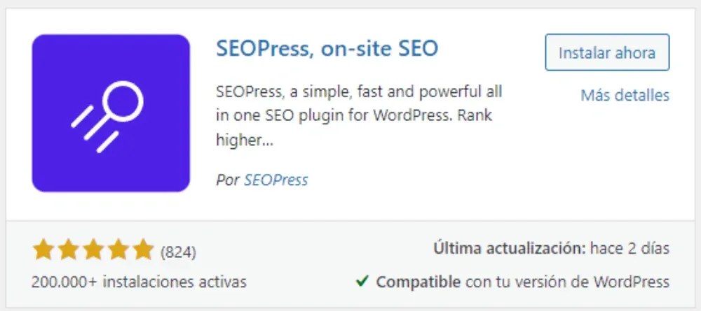 Permite analizar la situación actual de tu estrategia de SEO a través de un panel de información. El proceso de configuración es muy rápido, lo que le convierte en un plugin muy sencillo y usable.