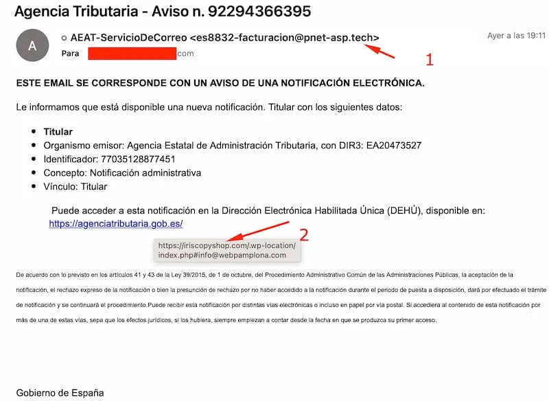 - El dominio del remitente no es el que aparece ahí ya que el dominio de Agencia Tributaria es https://sede.agenciatributaria.gob.es/