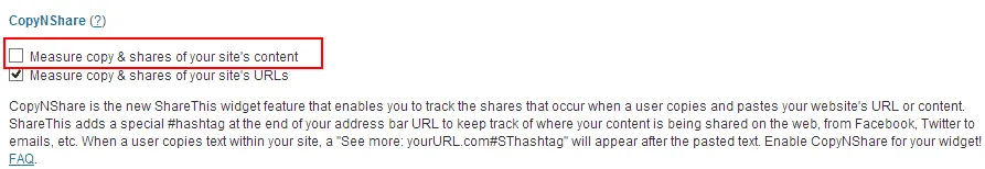 Pues bien, lo único que tienes que hacer es ir a la configuración del plugin ShareThis y buscar la opción “Measure copy & Share of your sites content” y desactivarla tal y como aparece en la siguiente imagen.